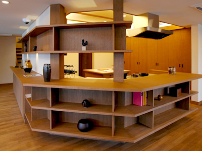 “建築物の一部”としての家具は、それ自体を製作して完成ではありません。いかに正確に美しく現場に収めるか――最も重要なその部分に、経験と技術が表れます。建物は、たとえ図面通りに施工しても寸法誤差が生じるもの。しかし、たとえばカウンターの天板と壁との間に1~2ミリでも隙間ができれば美観を大きく損ねるため、家具の側で寸法を調整する必要があります。また、設置場所近くに配線や配管がある場合、うまく避けたり隠したりする必要も生じます。工場での製作段階でこのような状況をあらかじめ予測して、調整可能な状態で家具を製作し、現場で“建築物”としてすぐれた美観となるよう仕上げるノウハウが、当社にはあります。